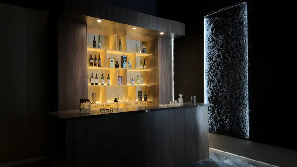 Lighting: Built-in warm ambience, pendant lights, and illuminated bar counter