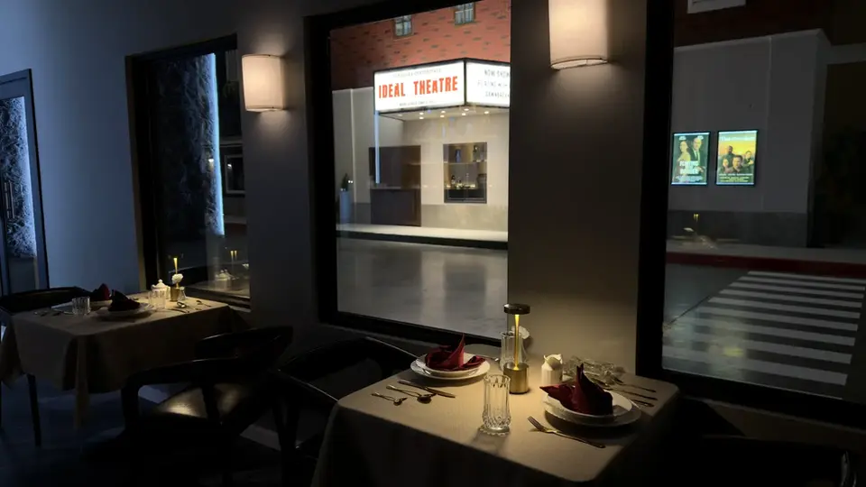 The lighting design throughout the set emphasizes warm ambience and subtle contrast, creating a cinematic atmosphere ideal for evening restaurant scenes, date nights, business dinners, or upscale social moments. The open floor plan allows for smooth dolly movement, Steadicam walk-ins, and multi-camera setups.