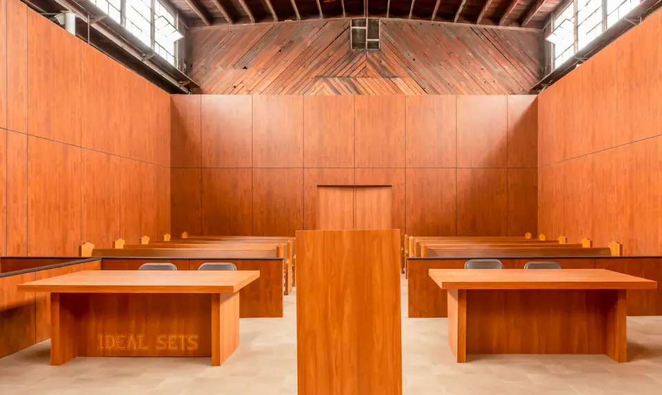 A standout feature of this set is the abundant natural light streaming through the large windows on both sides of the room. These windows provide beautiful ambient illumination that fills the space evenly, reducing the need for extensive artificial lighting. This makes the courtroom extremely budget-friendly for small and medium productions, allowing crews to achieve professional visual quality with fewer lighting units and shorter setup times.
