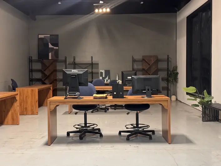 Pre-dressed Elements: Modular desks, chairs, open shelving, industrial decor elements — ready for styling or branding