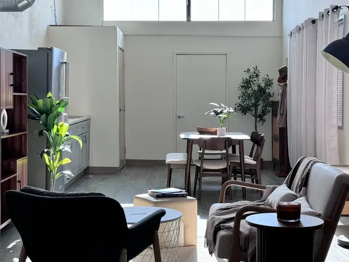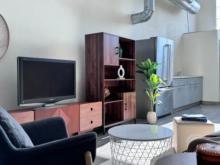 This standing set delivers a stylish modern loft/apartment environment, tailored for film, television, and commercial productions that demand an open-plan residential atmosphere with urban sophistication. The space is furnished in a mid-century modern style with clean finishes and contemporary touches, supplying an instant high-end aesthetic with minimal dressing.