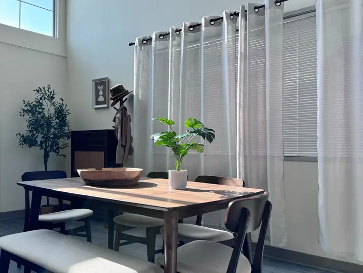 The interior features large windows that allow ambient daylight to flood the space, offering flexible lighting possibilities and enabling more budget-friendly setups. The open layout supports dynamic camera work, including long-tracking shots, crane setups, and fluid dialogue blocking across living, dining and kitchen zones. Neutral wall tones, polished floors and sleek furnishings provide a versatile backdrop—easily dressed up as a luxury loft, modern apartment, creative workspace or upscale residence.