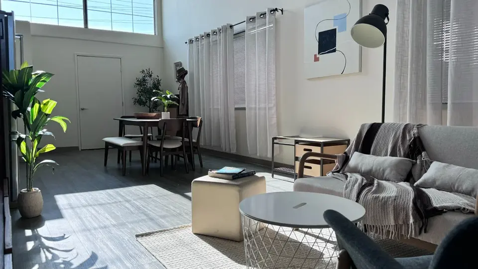 The interior features large windows that allow ambient daylight to flood the space, offering flexible lighting possibilities and enabling more budget-friendly setups. The open layout supports dynamic camera work, including long-tracking shots, crane setups, and fluid dialogue blocking across living, dining and kitchen zones. Neutral wall tones, polished floors and sleek furnishings provide a versatile backdrop—easily dressed up as a luxury loft, modern apartment, creative workspace or upscale residence.